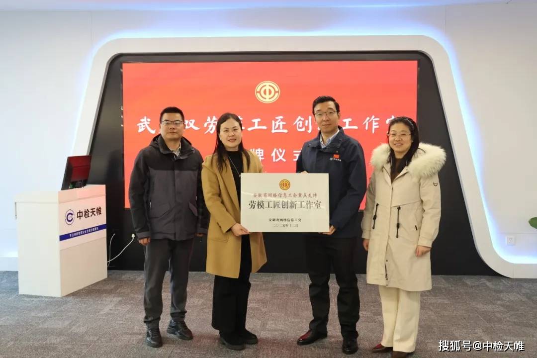 1月27日,安徽省网络信息工会主席尹云霞一行到访中检天帷,为“武建双劳模工匠创新工作室”授牌。
